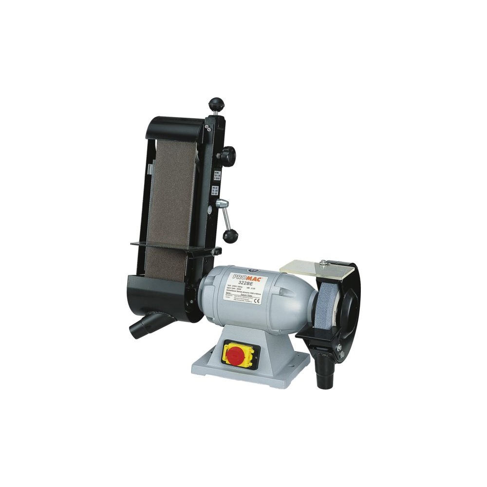 Interrupteur avec bobine antiredémarrage. Inter arrêt coup de poing. Alimentation : 400 V triphasée Puissance : 0,55 kW Vitesse de rotation : 2850 tr/mn Dimension de la meule : 200 x 25 x 20 mm Grain : 60 Dimension de la bande : 100 x 1000 mm Grain : 100 Poids : 27 kg Livré avec rallonge, disque à polir, bande grain 100 et meule grain 60.