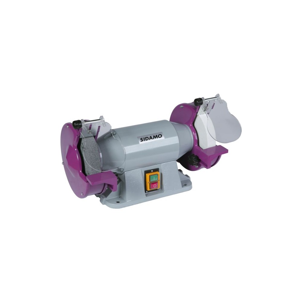 Corps en fonte d'acier. Carters en acier embouti équipés d'une buse de captage de poussières. Écrans de protection en polycarbonate. Alimentation : 230 V monophasée Puissance : 0,9 kW Vitesse de rotation : 2800 tr/mn Dimensions meule : 200 x 30 x 32 mm Grain : A36R et AA60M Poids : 30 kg Socle en option.Désignation : Touret | Puissance : 0,90 kW