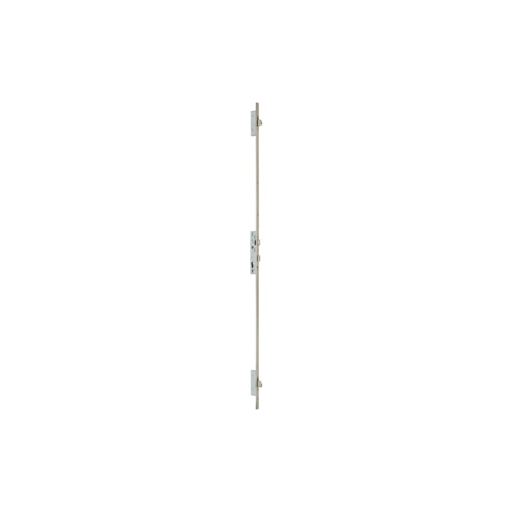Solution adéquate de remplacement de serrure à encastrer pour profils européens aluminium et acier. Compatible avec les standards du marché. Pêne dormant et ½ tour. Pêne ½ tour réversible. Dimensions coffre central : 244 x 18 mm Saillie pêne ½ tour : 12 mm Saillie du pêne dormant : 15,5 mm Entraxe : 92 mm Fouillot carré : 8 mm Têtière en U : 1860 x 24 mm Livrée sans gâche centrale et sans cylindre.Largeur : 36 mm