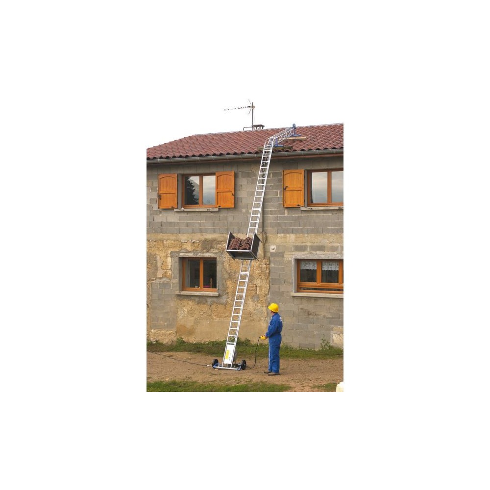 Utilisation pour les travaux de maçonnerie ou de couverture. Structure tubulaire acier galvanisé formant poutre triangulaire et assurant une excellente stabilité sous la charge. Installation simple et rapide avec dispositif d’auto-relevage. Embase avec fin de course bas et treuil intégré. Moteur caréné équipé d'un câble de Ø 5 mm - longueur 42 m. Hauteur d'accès max : 10 m Charge utile : 150 kg Genouillère avec réglage simple : 0 à 65° Angle de travail : 45 à 90Détails