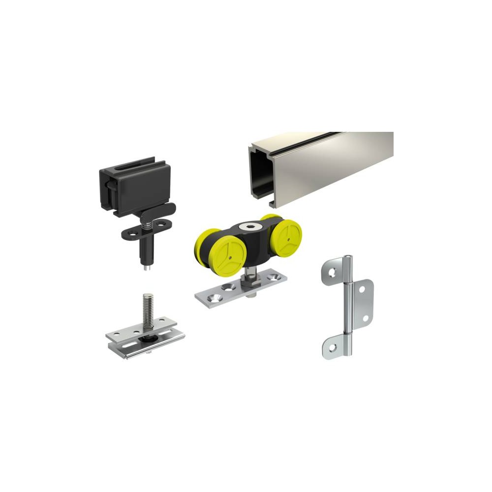 Réf. 53726 ensemble pour 2 panneaux comprenant : - 1 rail SAF en aluminium anodisé, longueur 1.50m, - 1 monture SAF sur roulements à bille, avec platine, - 1 pivot haut et 1 pivot bas, - 3 charnières 1504C3 fixation sur chant, - vis de pose, clé de montage et notice de montage. Réf. 500099 ensemble pour 4 panneaux comprenant : - 1 rail SAF en aluminium anodisé, longueur 1.95 m, - 2 monture SAF (galets montés sur axe lisse et roulements à billes) avec platine, - 2 pivots haut, - 2 pivots bas, - 6 charnières 1504C3 (fixation sur chant), - Vis de pose, clé de réglage et notice de montage.Réf. mantion:TANGO40-150
