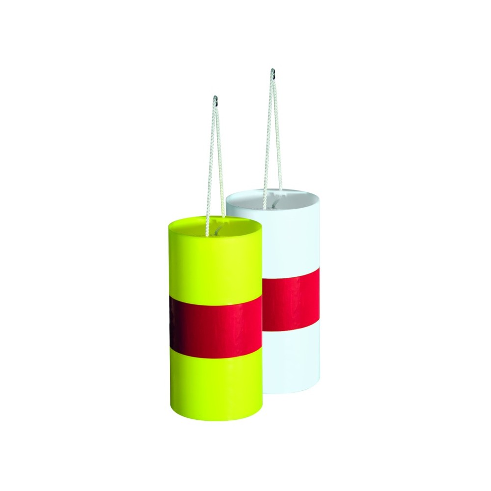 Fixation par drisse nylon. Boîtier cylindrique en polypro blanc ou jaune fluo pour encore plus de visibilité. Bande horizontale rouge rétroréfléchissante.