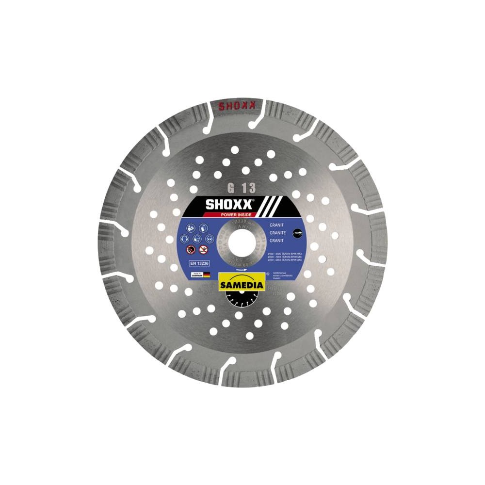 Pour une coupe ultra-rapide dans le granit et les matériaux très durs. Segments soudés au laser. Hauteur diamantée : 13 mm Norme : EN 13236Ø : 230 mm | Alésage : 22,2 mm