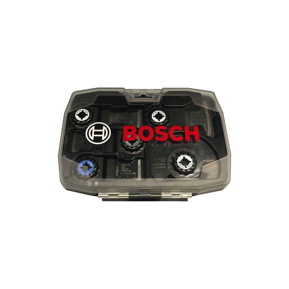 Emmanchement Starlock®. Composé de : - 1 lame ACZ 85 EB pour bois et métal, - 1 lame AIZ 32 AT lame plongeante à concrétion carbure pour métal, 32 mm, - 1 lame AIZ 32 APB pour bois et métal, - 1 lame AII 65 APB pour bois et métal, - 1 lame AIZ 32 APB pour bois et métal.