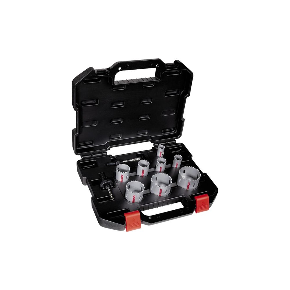 Bimétal, pour la découpe des aciers, des inox, des non-ferreux, des bois cloutés. Mallette robuste, sécurisable par cadenas. Composé de : - 8 scies Ø 22 - 25 - 29 - 35 - 40 - 51 - 60 - 67 mm, - 2 arbres.
