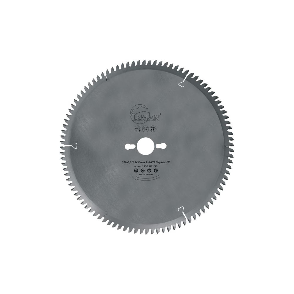 "Lame de scie circulaire pour métaux ferreux et non-ferreux. Pour la coupe de profilés aluminium minces, profilés plastiques, cadre et tôles aluminium. Scie à mouvement radiale et avance manuelle.Alésage : 30 mm | Dents : 96 TP NEG ALU | Ø lame : 300 mm | Épaisseur segment : 3,2/2,5 mm"