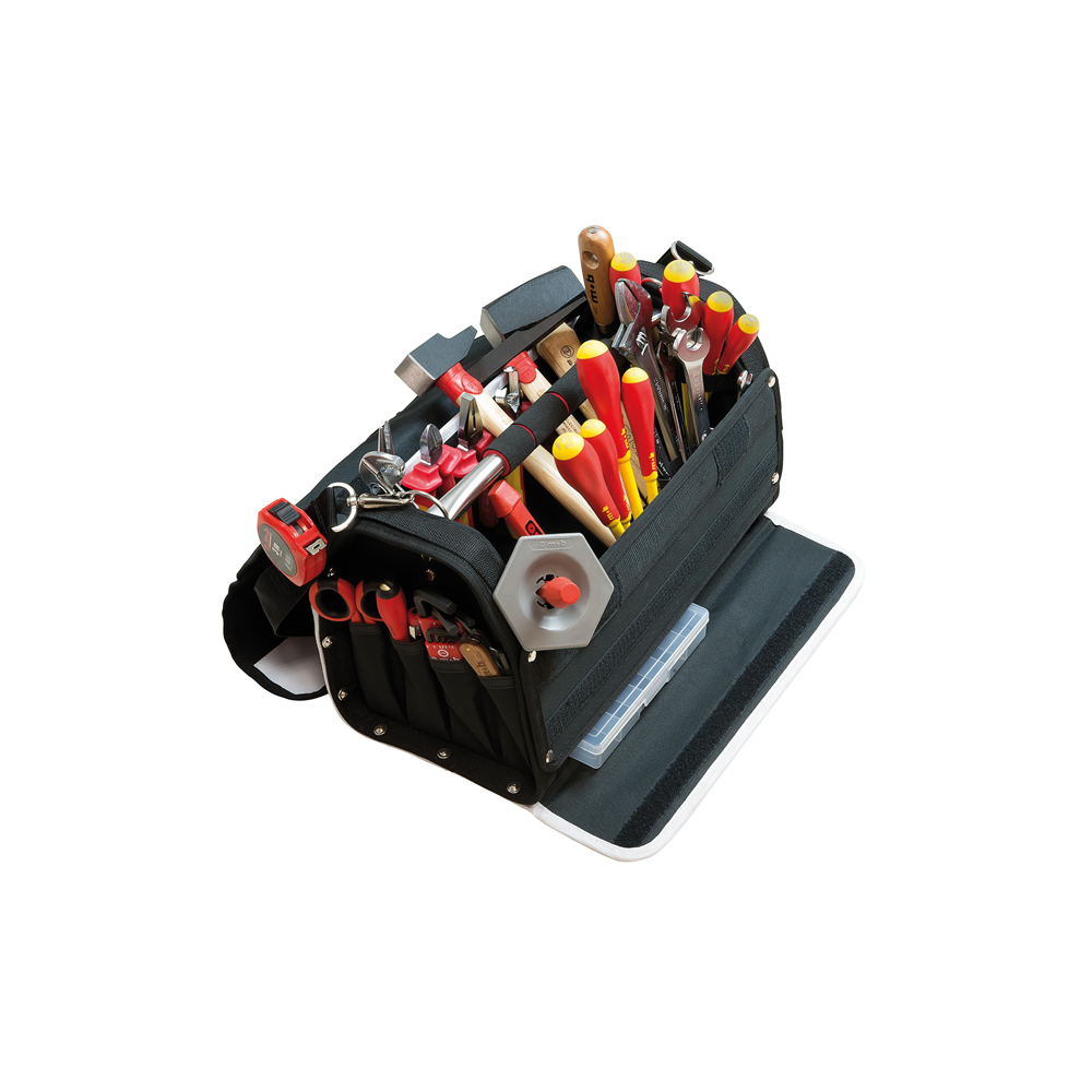 Boite à outils textile. Multiples poches intérieures et latérales. Nouvelles poches intérieures élastiques pour un rangement facilité. Poignée mousse confortable. Bandoulière réglable avec fourreau antidérapant. Base en polypropylène à patins 1,7 cm. Poignée : barre métal surmoulée. Toile 600 Deniers résistante à l'usure et aux accros. Rabat de protection. Côtés renforcés. Modèle avec soute