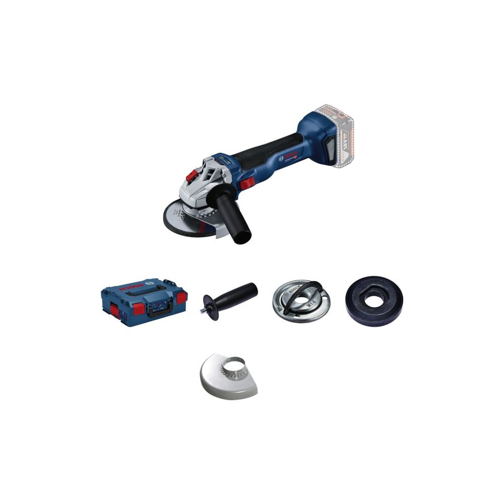 Fonctionne sur batterie 18 V. Meuleuse pour disque Ø 125 mm. Démarrage progressif, contrôle des vibrations, kick-back control et fonction freinage. Vitesse : 9000 tr/mn Poids : 2 kg Livrée en coffret L-Boxx avec flasque de serrage, écrou de serrage, capot de protection, cléà ergots, poignée supplémentaire, sans chargeur ni batterie.