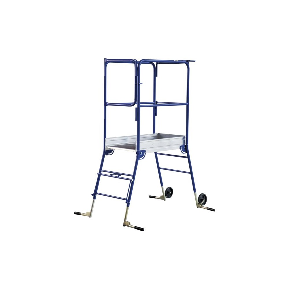 Utilisation sur sol plat et dénivelé. Usage intensif. En acier, finition époxy. Ceinture de protection 360° avec portillon rigide. Plateau de 900 x 500 mm. Tablette porte-outils intégrée. Réglage indépendant des 4 pieds. Roues de déplacement Ø 150 mm. Hauteur de travail modulable : 2,65 m / 2,80 m / 3 m Charge maxi. : 150 kg Poids : 29,650 kg Norme : NF - PIRL 93353 - Décret 2004-924