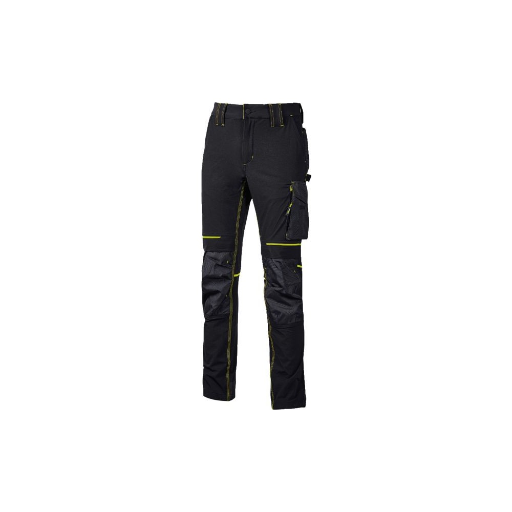 90% nylon, 10% spandex, 260 g/m². Tissu stretch, doux au toucher, déperlant, respirant, séchage rapide. Taille élastiquée, bavette à l?arrière pour une meilleure protection lombaire. Poches latérales porte-outils, multifonction avec porte badge rétractable, 2 poches arrières, poches zippées sous une grande poche latérale. Emplacements pour genouillères réf. 103541 (à commander séparément). Bas de pantalon entièrement renforcé en polyoxford 600D. Coloris : noir/jaune, marine/orange Taille : M à 3XL Norme : CE Cat II - EN 14404 (si porté avec les genouillères)Type : pantalon
