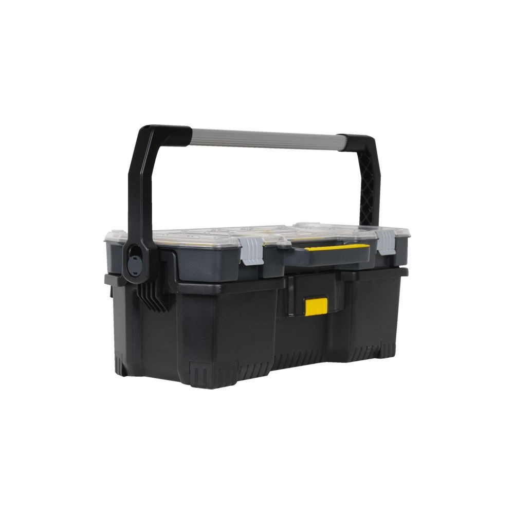 Caisse avec organiseur pour la visserie et petits accessoires. Bouton sur le devant pour libérer la partie haute de la caisse. Grande poignée en aluminium pour faciliter le transport. Volume utile : 53 l Capacité de chargement : 18 kg Dimensions : 670 x 323 x 283 mm Livrée sans outils.