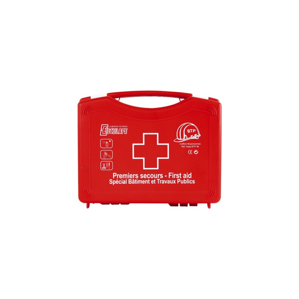 Mallette spécialement conçue pour les besoins des professionnels du BTP et de la maintenance en fonction des risques et de l'importance du chantier. Coffret en polypropylène rouge sérigraphié, contenu varié et complet permettant de nombreuses interventions rapides et efficaces. La mallette BTP 5 convient parfaitement aux petites équipes du BTP et aux artisans. Compacte, elle se range facilement dans un véhicule. Les coffrets BTP 10 et BTP 20 sont équipés d?un support mural, leurs dimensions plus importantes permettent d?intégrer des contenus très complets, conformes aux recommandations de l?OPPBTP.Type : trousse de secours : Compatibilité personne : 5