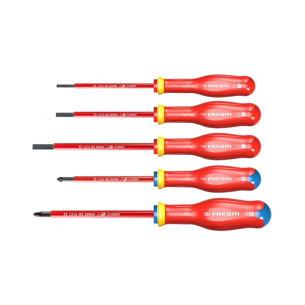 • Traitement thermique en ligne : + 100% de durée de vie et + 100% de résistance.• Matière du manche : Soft Grip pour plus de confort et toujours résistant aux produits chimiques.• Ergonomie optimisée du manche : + 10% de couple.• Marquage laser : pour une meilleure résistance à l'usure.• Usinage des empreintes par commande numérique : meilleure adaptation de la vis en augmentant le transfert de couple et en réduisant l'usure.• Livré en boîte..• Contenu : AT2.5X75VE - AT3X100VE - AT3.5X100VE - AT4X100VE - AT5.5X125VE - AT6.5X150VE - ATD1X100VE - ATD2X125VE