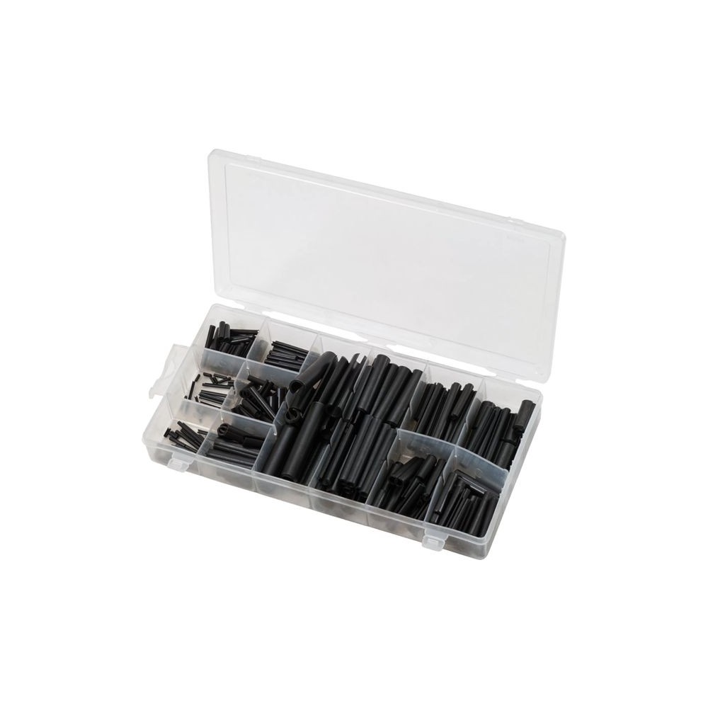 Composé de 315 goupilles élastiques : - Ø 1,5 x 5 mm (10 pièces), - Ø 1,5 x 8 mm (10 pièces), - Ø 1,5 x 20 mm (10 pièces), - Ø 2 x 6 mm (10 pièces), - Ø 2 x 12 mm (10 pièces), - Ø 2 x 25 mm (10 pièces), - Ø 2,5 x 16 mm (10 pièces), - Ø 2,5 x 25 mm (10 pièces), - Ø 2,5 x 30 mm (10 pièces), - Ø 3 x 16 mm (15 pièces), - Ø 3 x 25 mm (15 pièces), - Ø 3 x 30 mm (15 pièces), - Ø 4 x 16 mm (10 pièces), - Ø 4 x 25 mm (10 pièces), - Ø 4 x 40 mm (10 pièces), - Ø 5 x 16 mm (15 pièces), - Ø 5 x 25 mm (15 pièces), - Ø 5 x 30 mm (15 pièces), - Ø 5,5 x 16 mm (10 pièces), - Ø 5,5 x 30 mm (10 pièces), - Ø 5,5 x 45 mm (10 pièces), - Ø 6 x 16 mm (10 pièces), - Ø 6 x 30 mm (10 pièces), - Ø 6 x 45 mm (10 pièces), - Ø 8 x 20 mm (10 pièces), - Ø 8 x 40 mm (10 pièces), - Ø 8 x 50 mm (10 pièces), - Ø 10 x 20 mm (5 pièces), - Ø 10 x 40 mm (5 pièces), - Ø 10 x 50 mm (5 pièces).